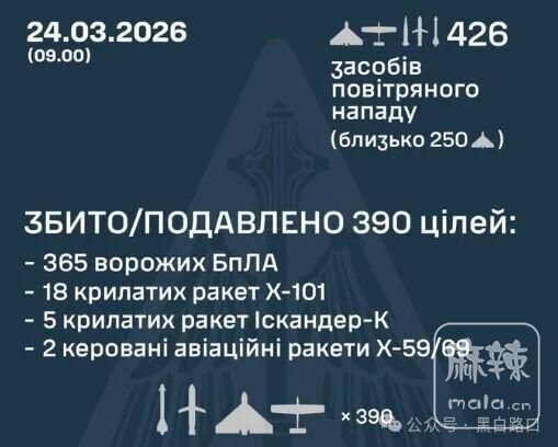 3月24日,俄罗斯发射392架无人机、34枚导弹共426个目标袭击乌克兰,乌军击落365架无人机、25枚导弹共390个目标,22个地点记录到撞击,10个地点有残骸落下。