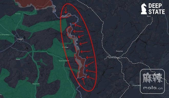 苏梅前线,俄罗斯军队已推进至莫罗皮尔斯克、玛丽涅、新莫德季特里夫卡等三个村庄附近,目前已在沿苏梅地区的边界线形成了由其控制及渗透区域(红区与灰区)面积约为150平方公里的所谓缓冲区,