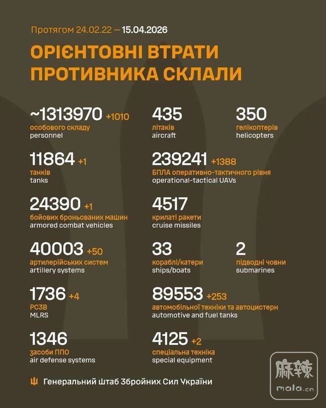 乌总参公布的昨日战果,歼敌(击毙+重伤)1010人。