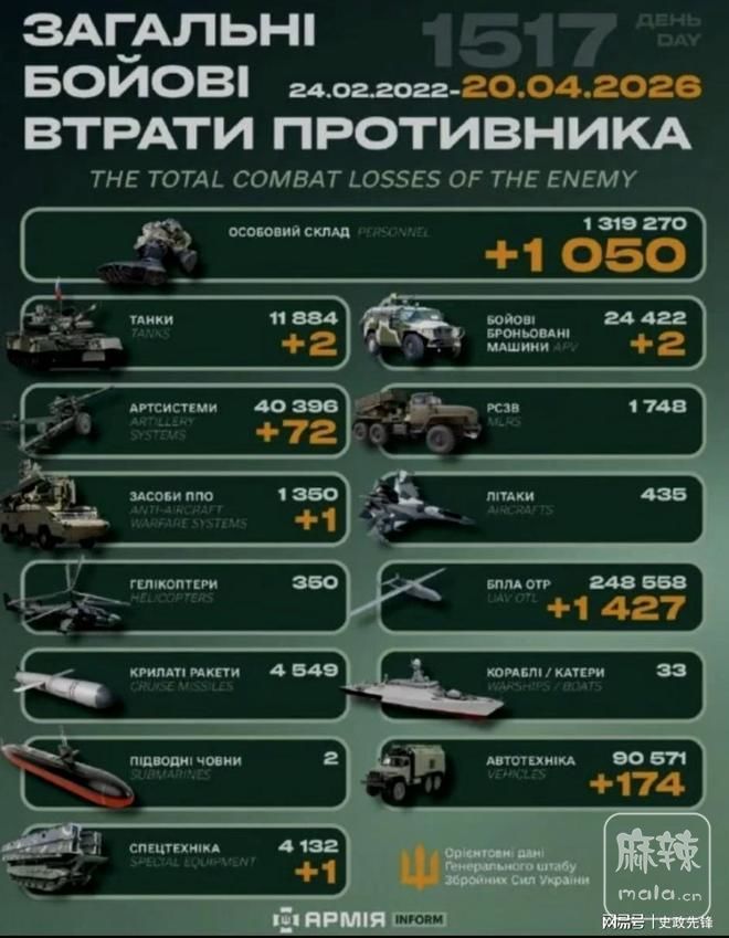 今天是乌克兰卫国战争第1517天,乌总参发布战报,过去24小时里乌克兰武装部队共歼敌1050人