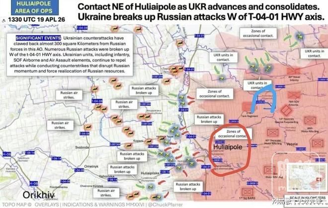 胡里亚伯波尔方向,乌军沿着T-04-01公路扫荡,该公路从胡里亚波尔市穿过,俄军当下仅有少量兵力残存在公路上。由于担心乌军顺着公路进攻,俄军已将主力部队撤到了市区东面,在城西仅留下了少量部队防御……零散乌军目前进入了城内作战,北面乌第19军团距市区也越来越近,钳形攻势将很快形成。